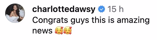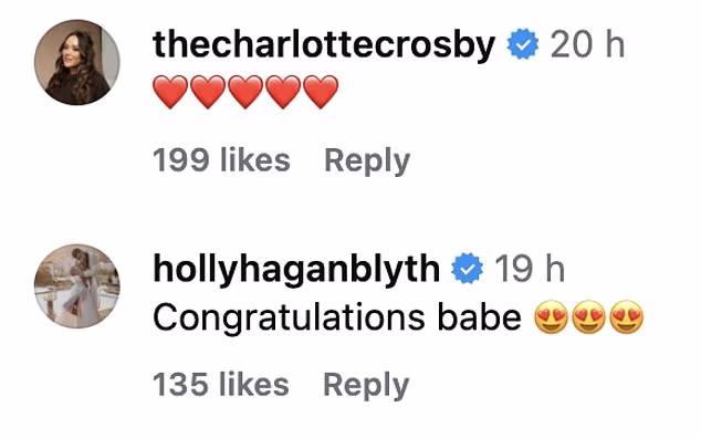 Obožavatelji i slavni prijatelji brzo su podijelili svoje čestitke s Charlotte Crosby koja je objavila niz emotikona srca, a Holly Hagan komentirala je: ‘Čestitamo dušo’.