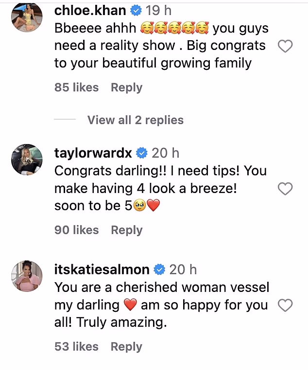 Gospođa Hinch je dodala: ‘Nevjerojatne čestitke’, a Chloe Khan je rekla: ‘Bbeeee ahhh vama treba reality show. Velike čestitke vašoj lijepoj rastućoj obitelji’.