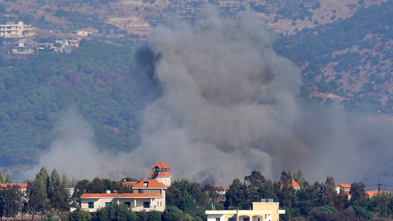Dim se diže nakon izraelskog zračnog napada na selo Khiam, gledano iz grada Marjayoun, južni Libanon, utorak, 24. rujna 2024. (AP Photo/Hussein Malla)