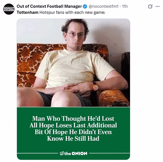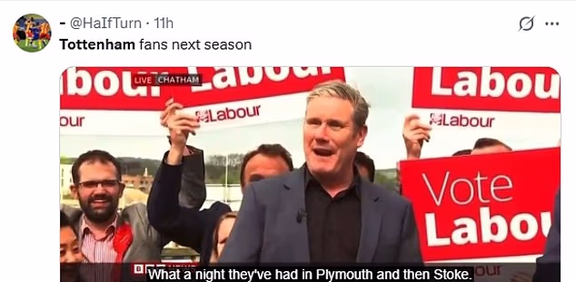 Gagovi vezani uz prvenstvo bili su aktualna tema, s drugim korisnikom koji je podijelio isječak Keira Starmera kako govori nakon što su laburisti pobijedili na izborima, govoreći: ‘Kakva je noć bila u Plymouthu, a zatim u Stokeu,’ u vezi s neglamuroznim danima u gostima s kojima bi se Spursi mogli susresti u sljedećem mandatu.