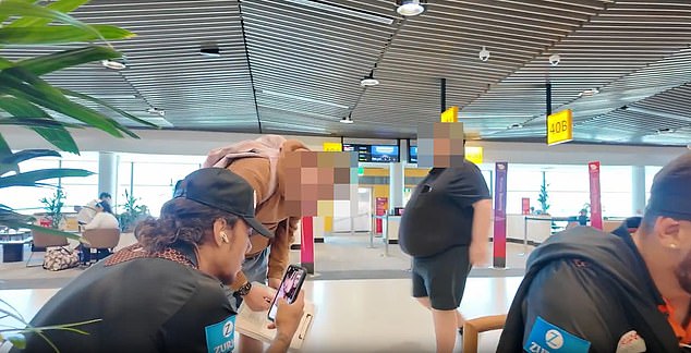 Na slici: Onog trenutka kada Wests Tigrovi zvijezda Jarome Luai (lijevo) spušta obožavatelja (drugog s lijeve strane) koji ga je prošlog vikenda zamolio za selfie u zračnoj luci Brisbane dok je bio na pozivu na FaceTime