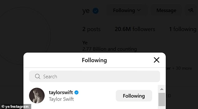 Kanye West naizgled je skrenuo sa svojom odnosom s Taylor Swift, jer je popstar učinio jedinim računom na Instagramu koji slijedi