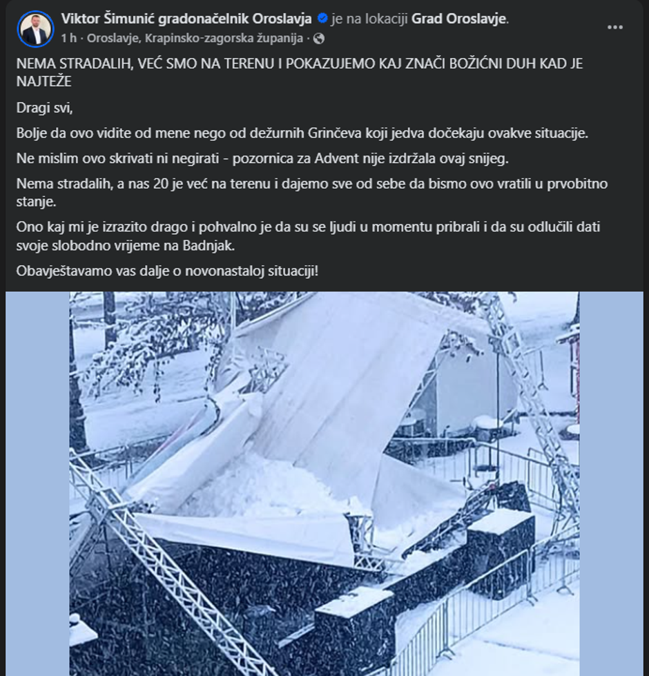“Bolje da ovo vidite od mene nego od dežurnih Grinčeva koji jedva dočekaju ovakve situacije. Ne mislim ovo skrivati ni negirati – pozornica za Advent nije izdržala ovaj snijeg”, poručio je gradonačelnik Šimunić putem Facebooka. Dodao je da je na terenu već 20 ljudi i da ulažu jake napore kako bi se situacija što prije dovela pod kontrolu.