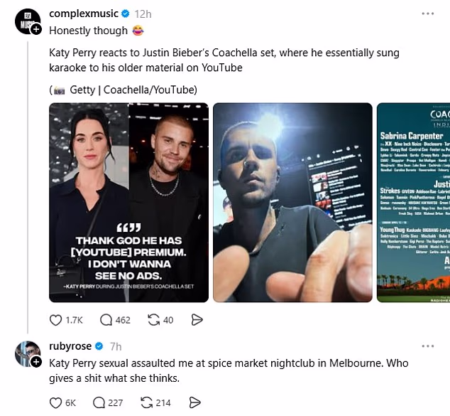 Ruby je to optužila kao odgovor na objavu o Katynoj reakciji na nastup Justina Biebera na Coachelli