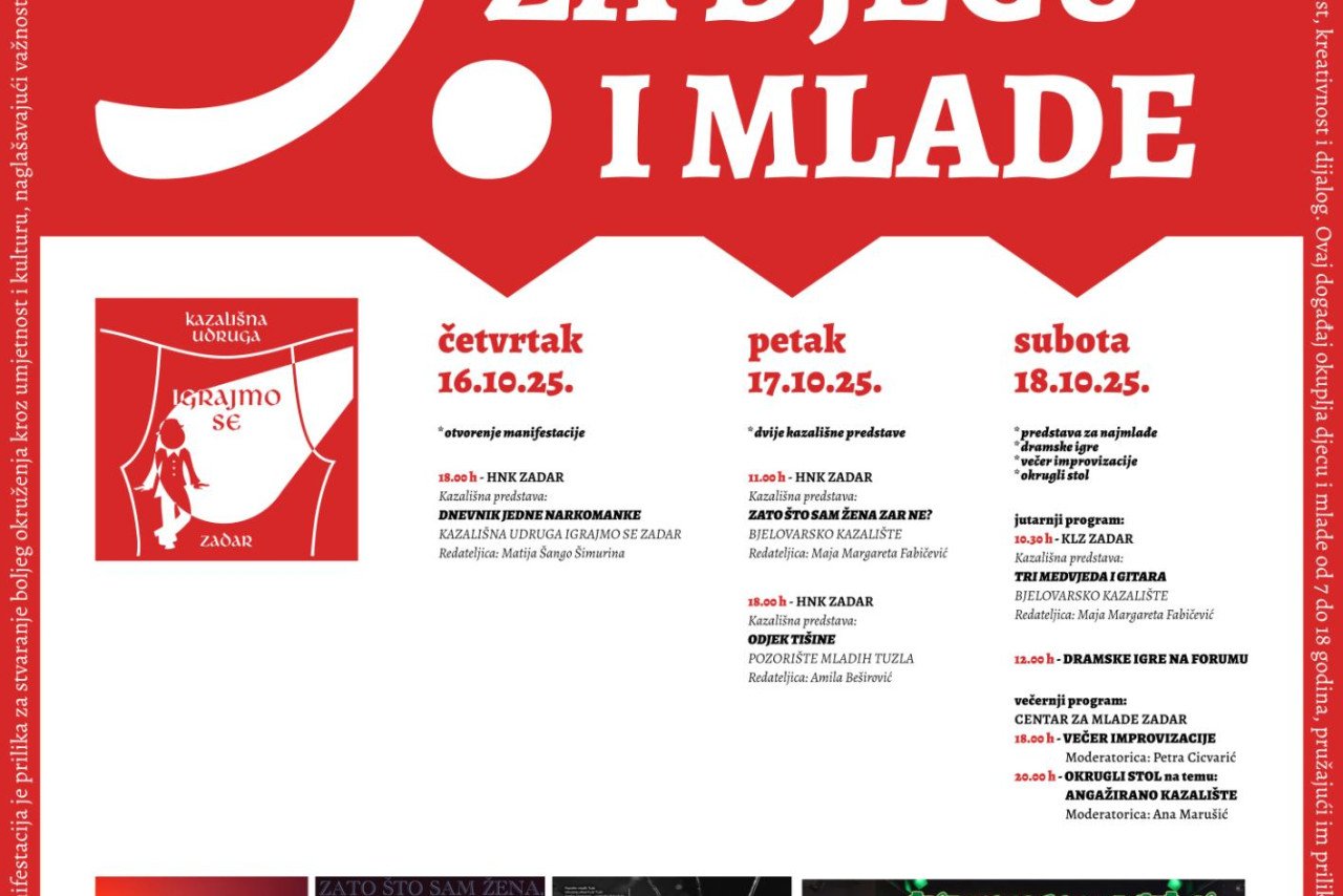 Program manifestacije započinje u četvrtak, 16. listopada, u Hrvatskom narodnom kazalištu (HNK) Zadar, izvedbom predstave „Dnevnik jedne narkomanke“ u izvedbi Kazališne udruge Igrajmo se iz Zadra. Predstava je nastala na inicijativu samih mladih glumaca i bavi se aktualnom temom ovisnosti, prikazujući dirljivu i iskrenu ispovijest tinejdžerice koja vodi dnevnik o svojoj borbi s drogom. Glavnu ulogu tumači Antonija Mašina, dugogodišnja polaznica Igrajmo se, a kroz izvedbu će nas provesti pedesetero djece i mladih u dobi od 7 do 18 godina. Predstava traje sat i petnaest minuta, a namijenjena je učenicima od petog razreda osnovne škole, njihovim roditeljima te svima koji rade s djecom i mladima u odgojno-obrazovnom sustavu.