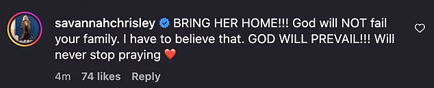 Savannah Chrisley ostavila je komentar koji glasi: ‘DOVEDI JE KUĆI!!! Bog NEĆE iznevjeriti vašu obitelj. Moram vjerovati u to. BOG ĆE POBIJEDITI!!! Nikada se neće prestati moliti.’