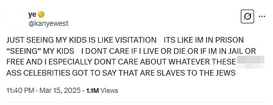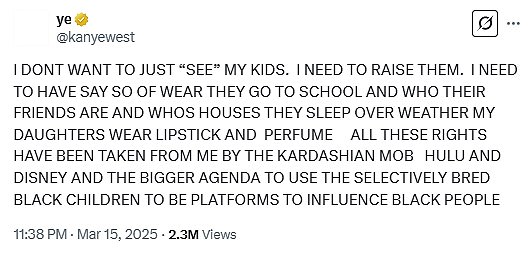 West je nedavno na Kim na X -u povisio zbog njegovih prava na posjete i napisao da su njegova 'prava oduzela Kardashian Mob, Hulu i Disney' i dodali da su i drugi koji imaju mišljenja o njemu 'robovi Židovima'