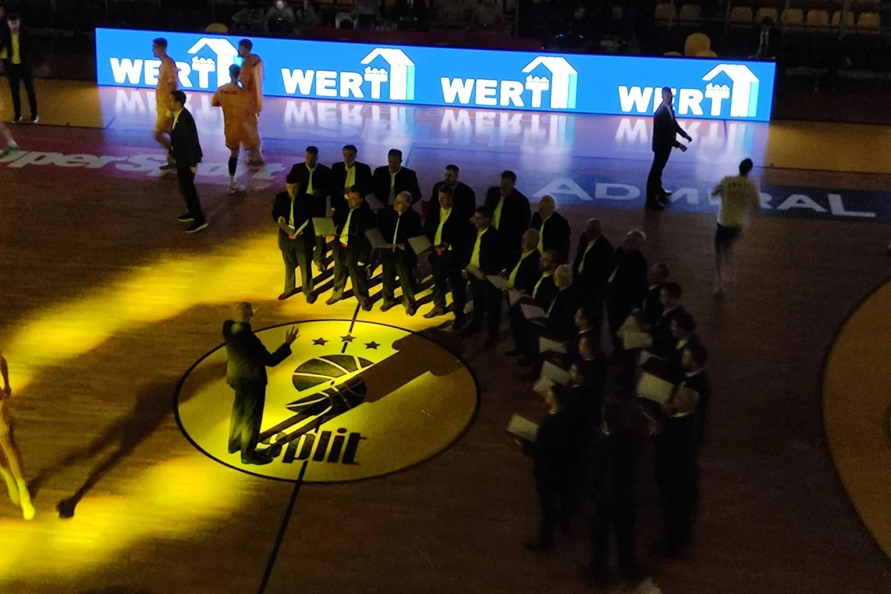 Neuobičajen, emotivan je bio početak dalmatinskog derbija hrvatskog košarkaškog prvenstva između Splita i Zadra na Gripama. Uoči početka susreta himna se u pravilu pušta s razglasa. Ovaj put, dva dana prije Dana sjećanja, himnu je na parketu dobro popunjenih Gripa izvela klapa.