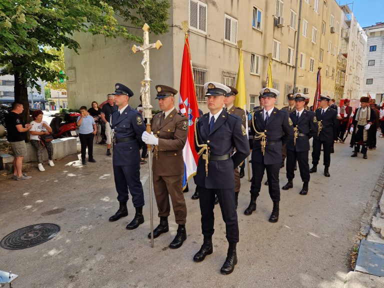 Euharistiju u crkvi Gospe Sinjske predslavio je vojni ordinarij u Republici Hrvatskoj Jure Bogdan, u zajedništvu s generalnim vikarom Vojnog ordinarijata u RH don Markom Medom, gvardijanom i upraviteljem sinjskog Svetišta fra Marinkom, biskupskim vikarom za pastoral MORH-a i OS RH don Slavkom Rajičem, biskupskim vikarom za pastoral MUP-a i Redarstvenih službi vlč. Franom Musićem, vojnim i policijskim kapelanima te drugim svećenicima. Zapovjednik hodočašća brg. Krešimir Ražov na početku mise upalio je zavjetnu svijeću hodočašća. Biskup Bogdan je u homiliji podsjetio da je spomendan sv. Joakima i Ane. „Isusovi djed i baka nisu bili prisutni u njegovom djetinjstvu jer su Marija i Josipa morali bježati iz Betlehema. Kakva je to kultura gdje je tek začeto dijete prijetnja? Isus svoj križ počinje nositi u trenutku svog rođenja“, naglasio je. Podsjetio je na Svjetski dan djedova, baka i starijih osoba koji se po odluci pape Franje obilježava na četvrtu nedjelju u srpnju, po spomendanu roditelja BDM, ove godine četvrti put. „Papa Franjo u poruci, pod geslom Ne napusti me u starosti (71, 9), poručuje nam da Bog ne napušta svoje djece nikada. Ni u poodmaklim godinama, kada život prijeti da se čini beskorisnim. Ne baca ni jedan kamen. Stariji kamen je sigurniji na koji se može staviti novi kako bi činili zajedno duhovnu kuću. Danas mnogi traže autonomiju. Prijelaz s mi na ja jedan je od najjasnijih znakova našeg vremena. Obitelj, koja je prvo mjesto spasenja, postaje žrtva individualističke kulture. „Ne propustimo pokazati nježnost djedovima, bakama i starijim osobama u našim obiteljima, posjećujmo one koji su klonuli duhom i više se ne nadaju da je drugačija budućnost moguća“, poručio je.
