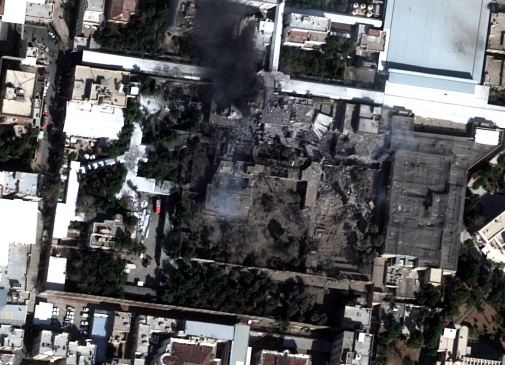 Satelitska snimka snimljena danas prikazuje crni dim i veliku štetu u kompleksu iranskog vrhovnog vođe ajatolaha Alija Hamneija. Najmanje četiri zgrade su pogođene u kompleksu u središtu Teherana. Satelitska fotografija je naslovna slika ovog članka, a jutros ju je objavio Airbus.