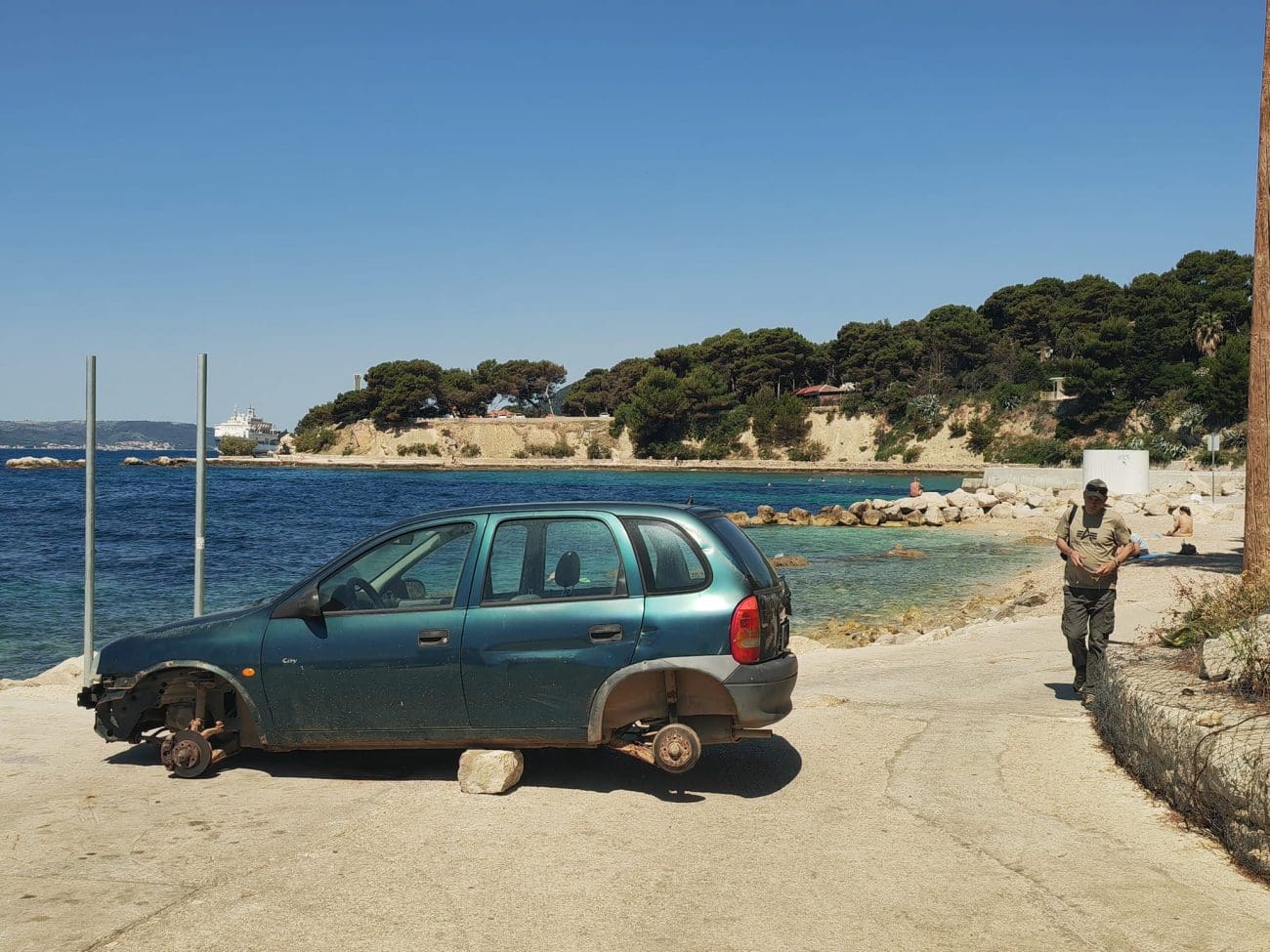FOTOGALERIJA Automobilska olupina na sredini popularne splitske plaže. Vlasnik nam tvrdi: “Vozilo je kupljeno tek jučer i pokvarilo se. Nije htjelo upaliti”