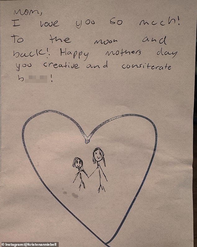 Unatoč neortodoksnom pravopisu i kreativnom nadimak, Kristenina kći – od kojih je jedna dala skandalozne komentare o privatnim dijelovima svog oca – jasno je dala jasno da joj je srce na mjestu pisanja kad je nacrtala fotografiju sebe kako se drži za ruke s majkom u njoj.