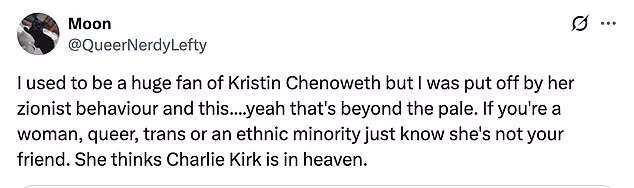 Dio reakcije društvenih medija na Chenowethinu javnu tugu zbog Kirkovih bila je usmjerena na njezina politička stajališta.