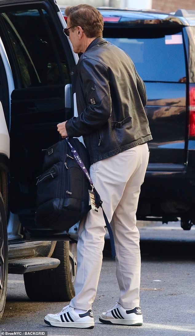 Clooney je izgledao cool kao i uvijek u sportskoj crnoj kožnoj jakni, koju je upario s casual bež chinosom i klasičnim crno-bijelim Adidasovim trenerima.