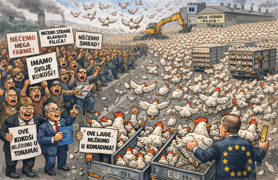 Jer drugi dio priče i to o peradi iz Ukrajine tek dolazi, ovaj put u obliku investicije. Privatni ulagači planiraju kod Siska gradit mega farmu pilića od sto tisuća tona piletine godišnje. Klaonica: kapacitet od nekih 82 milijuna pilića na godinu. Drugim riječima, industrija toliko velika da bi kokoši uskoro mogle postat važnije od lokalnog stanovništva. A oni nisu oduševljeni idejom da im krajolik miriše na gigantsku peradarsku ekonomiju, pa najavljuju prosvjede, što je i razumljivo; ljudi su nekako sentimentalno vezani za čisti zrak, koji ne dolazi iz – klaonice. Izgleda ne razumiju novu razvojnu strategiju. Izvozimo jaja, uvozimo jaja, a uskoro ćemo možda uvozit i – čisti zrak. Pa zar nije bolje naše jaje, nego tuđa kokoš?
