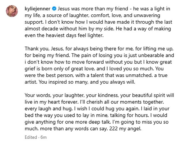 Odlazeći na Instagram u utorak, reality zvijezda Jenner, 27, napisala je: ‘Isus je bio više od mog prijatelja – bio je svjetlo u mom životu, izvor smijeha, udobnosti, ljubavi i nepokolebljive podrške.