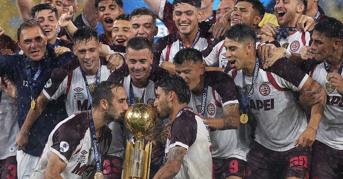 RIO DE JANEIRO, BRAZIL – 26. VELJAČE: Carlos Izquierdoz i Eduardo Salvio iz Lanusa podižu trofej prvaka nakon pobjede u utakmici CONMEBOL Recopa 2026 između Flamenga i Lanusa na stadionu Maracana 26. veljače 2026. u Rio de Janeiru, Brazil. (Fotografija Wagner Meier/Getty Images)