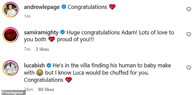 Pokazujući podršku svom zaručniku, reality zvijezdi Adam - s kojom je Laura bila od 2023. - komentirala je: 'Prekrasna djevojka'