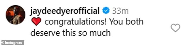 Voditelj Jaydee Dyer dodao je: ‘Čestitamo! Oboje to toliko zaslužujete. ‘