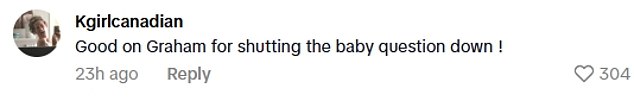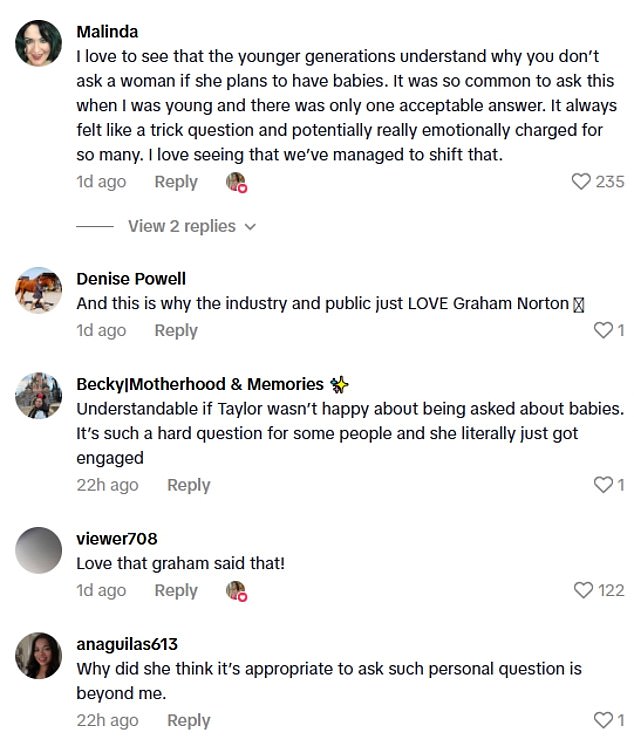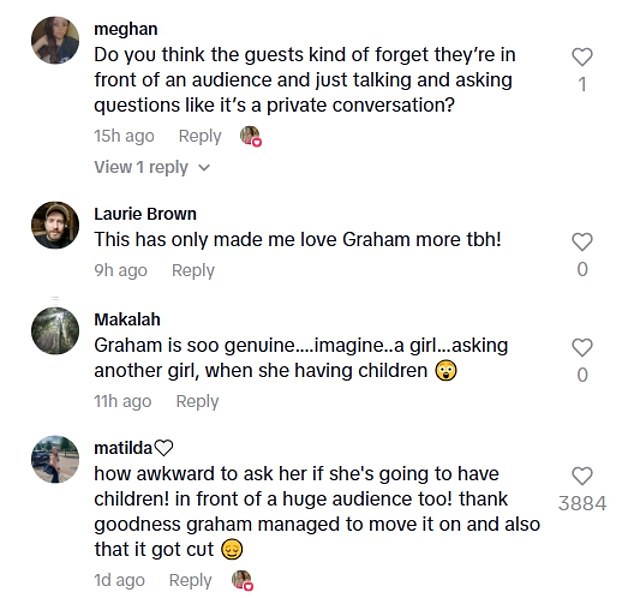 Jedan je napisao: ‘Stvarno mi je drago što je Graham skočio na pitanje o bebama jer je neprimjeren, posebno u TV emisiji. Ne mogu vjerovati da je to pitala. ‘