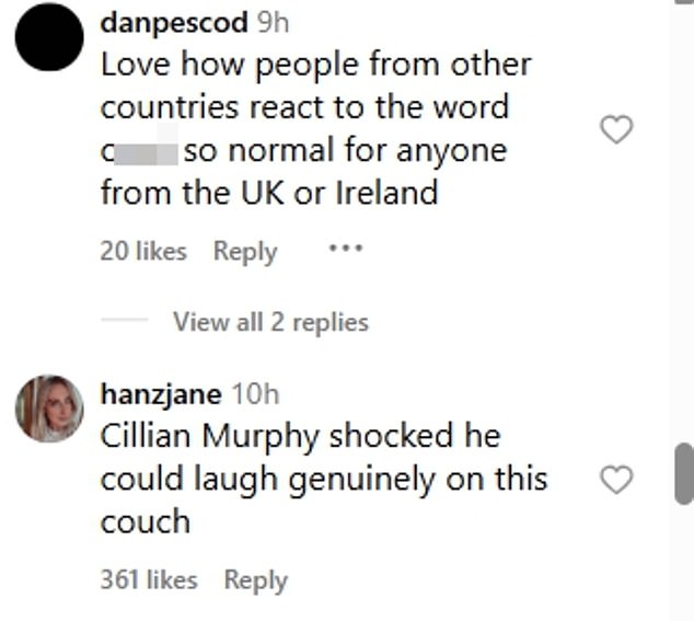Dijeleći svoja razmišljanja o zabavnom trenutku, gledatelji su se uputili u X i rekli: ‘Volite kako ljudi iz drugih zemalja reagiraju na riječ c ***, tako normalno za svakoga iz Velike Britanije ili Irske’; ‘Cillian Murphy šokirala je da se može istinski nasmijati na ovom kauču’;