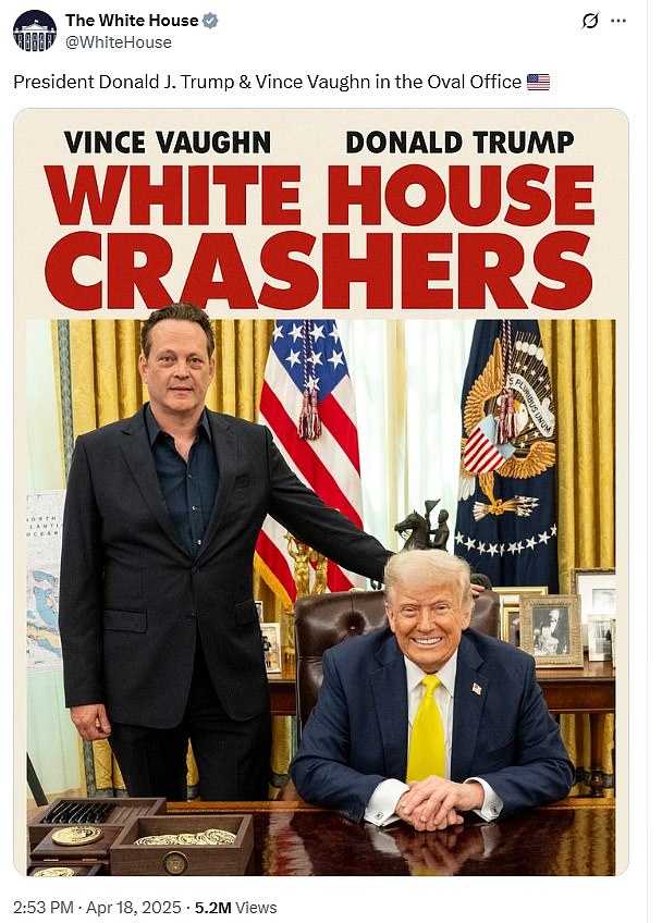 Hollywoodski glumac Vince Vaughn iznenadio je navijače posjetom Ovalnom uredu na Veliki petak, dok je Bijela kuća dijelila nasmijanu sliku o njemu s predsjednikom Trumpom.