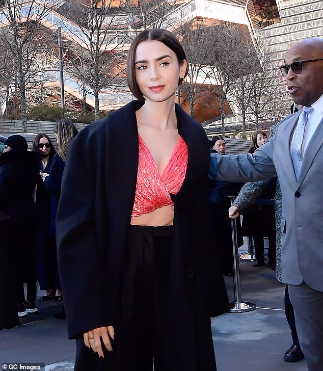 Lily Collins, 36, izgledala je bez napora šik u dubokom koraljnom kratkom topu dok je u petak prisustvovala modnoj reviji Calvina Kleina u New Yorku