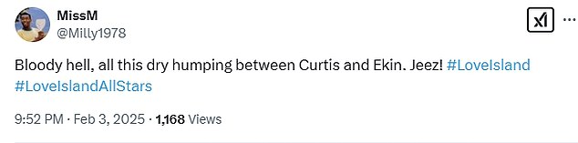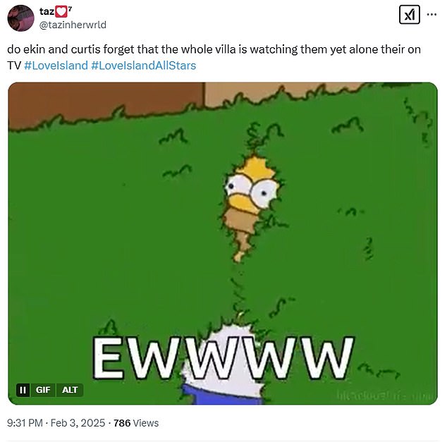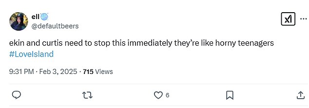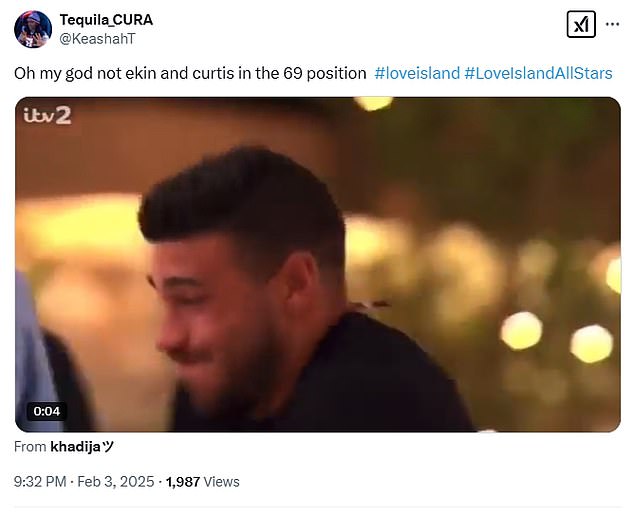 ‘O, moj Bože, a ne Ekin i Curtis u položaju 69’; ‘Da li Ekin i Curtis zaboravljaju da ih cijela vila gleda, a opet sama na TV -u’; ‘Ekin i Curtis trebaju to odmah zaustaviti kao da su kao napaljeni tinejdžeri’.