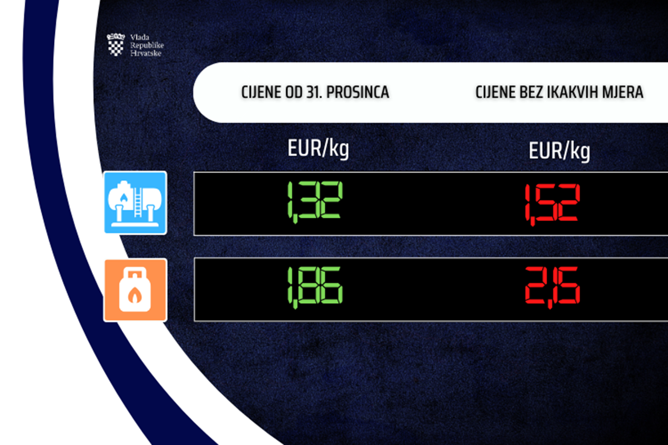 Danas je održana telefonska sjednica Vlade Republike Hrvatske na kojoj je donesena Uredba o utvrđivanju najviših maloprodajnih cijena naftnih derivata sukladno kojoj se najviše maloprodajne cijene računaju po formuli prema osnovnoj cijeni fosilnog goriva u prethodnom 14 dnevnom razdoblju, s ograničenom premijom od 0,1545 EUR/l za dizelsko i benzinsko gorivo, te 0,0781 EUR/l za plavi dizel, a u iznosu 0,8429 EUR/kg smjesa propan – butan za boce, odnosno 0,4116 EUR/kg za velike spremnike.