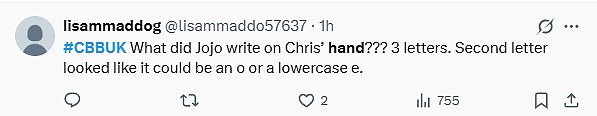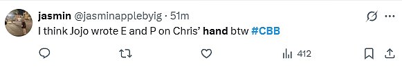 Jedan je podijelio: ‘Mislim da je JoJo napisao E i P na Chrisovu’ Hand Btw ‘, a drugi je dodao:’ Što je JoJo napisao na Chrisovoj ruci ??? 3 slova. Drugo slovo izgledalo je kao da bi to mogao biti O ili mala slova. ‘