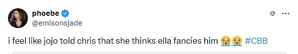 Uzimajući u X, ranije poznat kao Twitter, napisali su: “Ella se susreće kao da je ljubomorna na Chrisa i Jojoa”