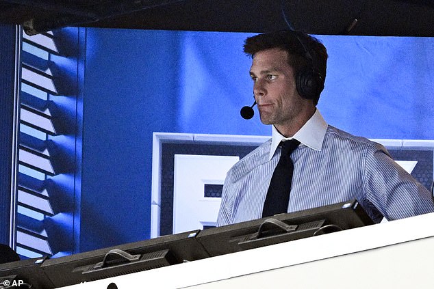 Bivši napadač NFL -a Tom Brady gleda sa kabine za emitiranje tijekom druge polovice nogometne utakmice NFL -a između Dallas Cowboysa i New Orleans Saintsa