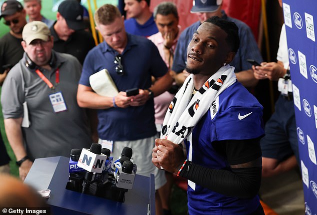 Malik Nabers se vidi kako u srijedu u New Jerseyju postavlja pitanja od novinara