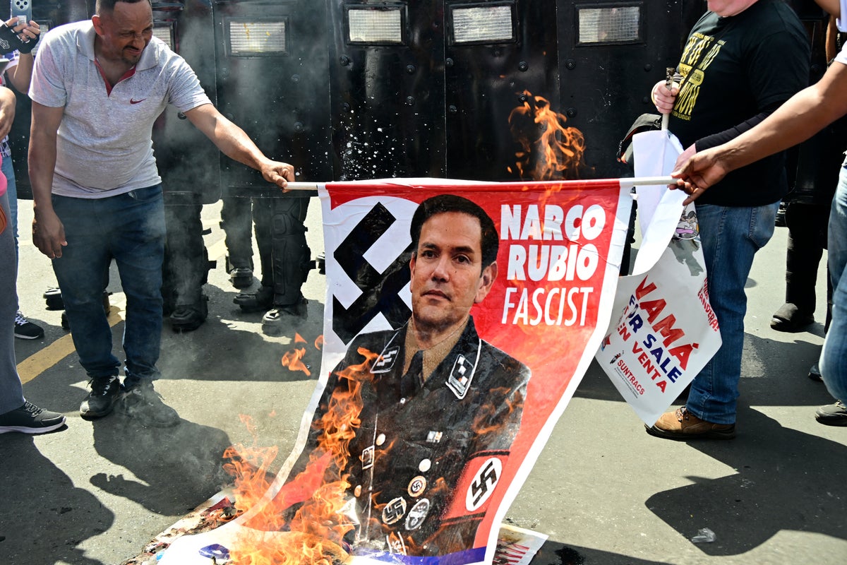 Demonstranti su tijekom prosvjeda protiv posjeta američkog državnog tajnika Marca Rubio u gradu Panama, sagorjeli i aluzivni znak (AFP putem Gettyja)