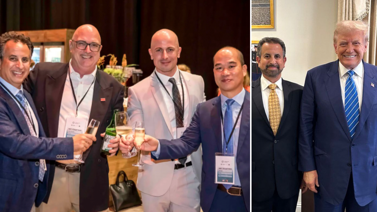 Tony Abboud and other members of the Global Vape Alliance toast each other at 2023 InterTabac trade show in Germany (Left) and (Right) Tony Abboud and then-presidential candidate Donald Trump pose for photo after a private meeting weeks before the 2024 election. (Global Vape Alliance/Vapor Technology Association X screenshot)