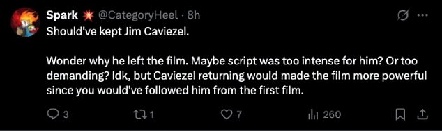 ‘Trebao je zadržati Jima Caviezela. Pitam se zašto je napustio film. Možda je scenarij bio previše intenzivan za njega? Ili previše zahtjevno? Idk, ali Caviezel Returding bi film učinio snažnijim jer biste ga slijedili iz prvog filma. “