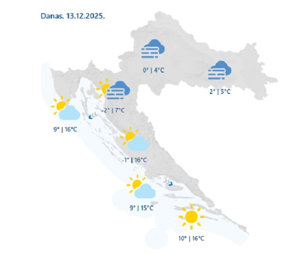 Vjetar slab, na otvorenom moru ponegdje umjeren sjeverozapadni. Najniža jutarnja temperatura zraka od -3 do 1, u Lici mjestimice niža, a na Jadranu između 5 i 10 °C.