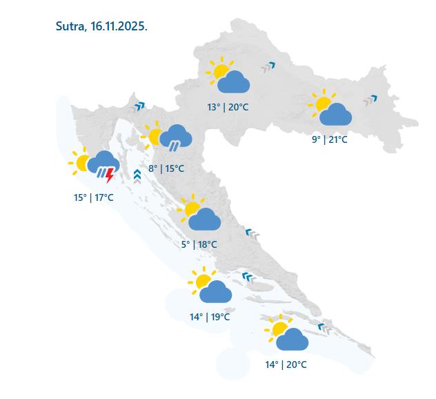 Dhmz najavljuje kako će magla biti sve rjeđa, a najoblačnije će biti na sjevernom Jadranu i u Gorskom kotaru, gdje je povremeno moguća slaba kiša. U unutrašnjosti će jugozapadnjak povremeno biti umjeren, u gorju i jak, dok će na moru jugo jačati prema ponedjeljku.