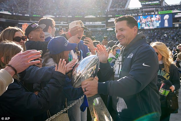 Glavni trener Seahawksa Mike Macdonald pozdravlja navijače prije parade u srijedu