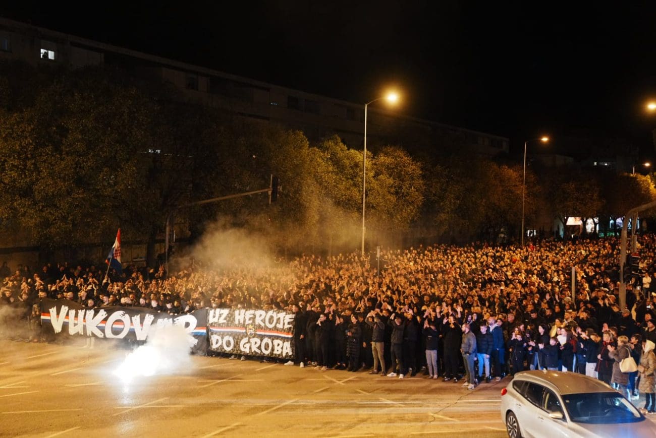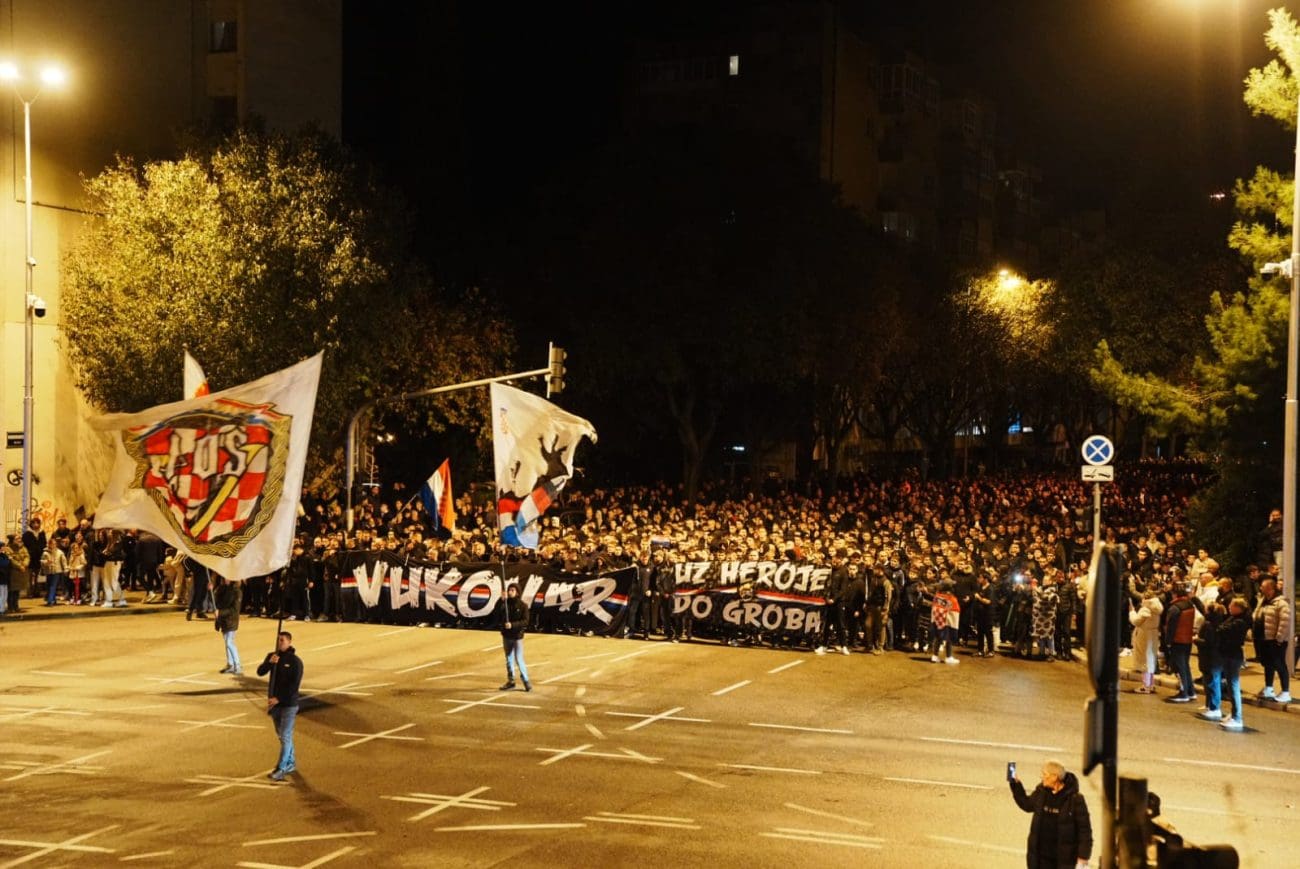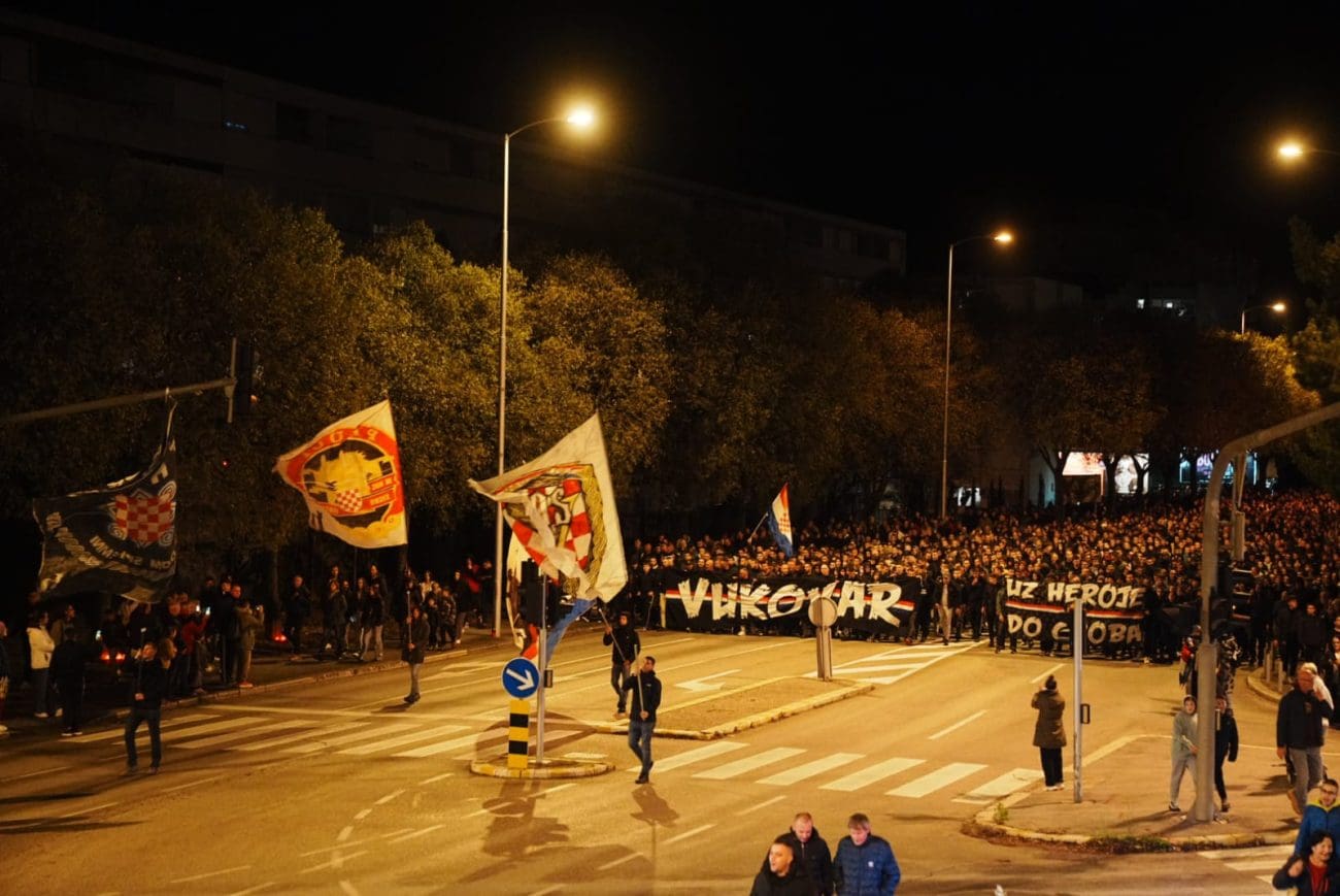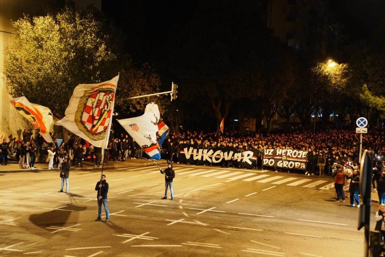 Tisuće Splićana, navijača Hajduka, branitelja i građana pridružile su se povorci duž Vukovarske ulice. Sudionici su nosili transparente ‘Vukovar – uz heroje do groba’.