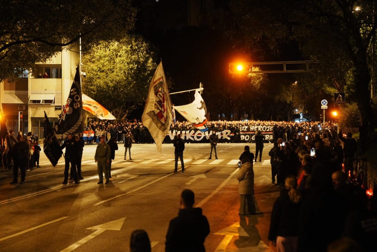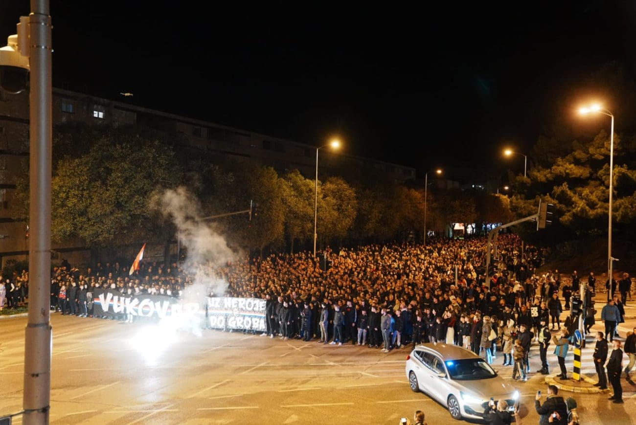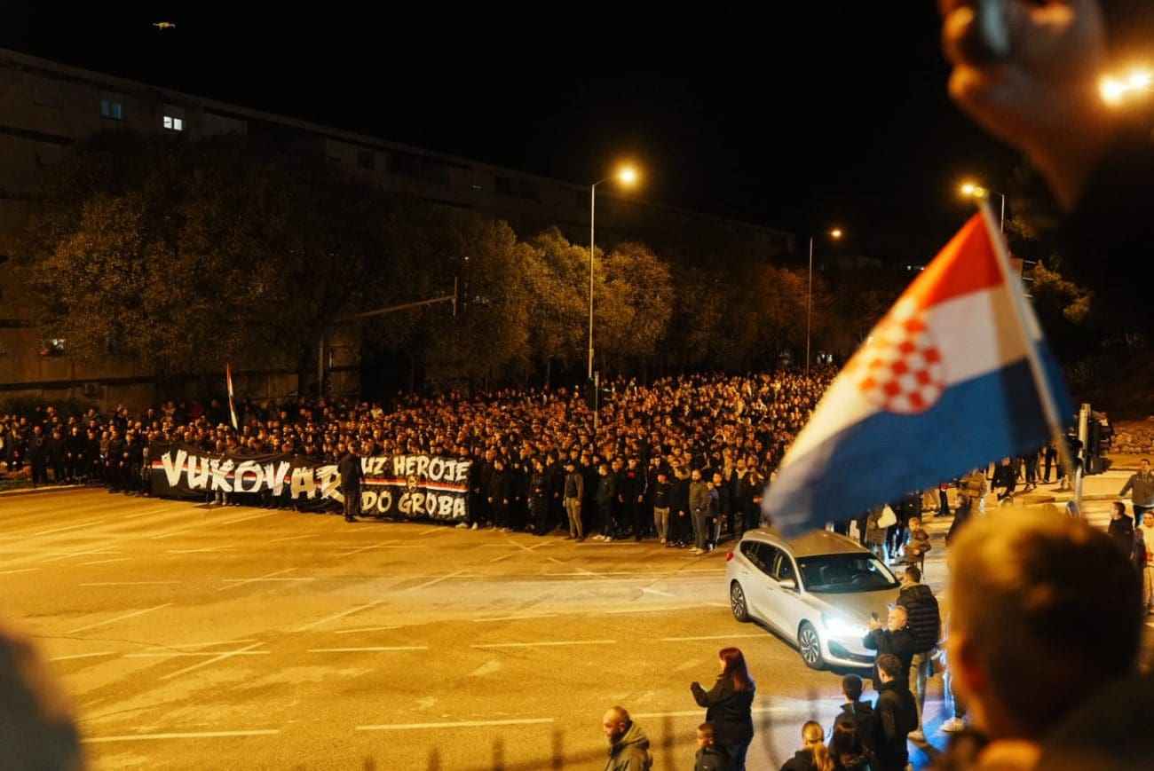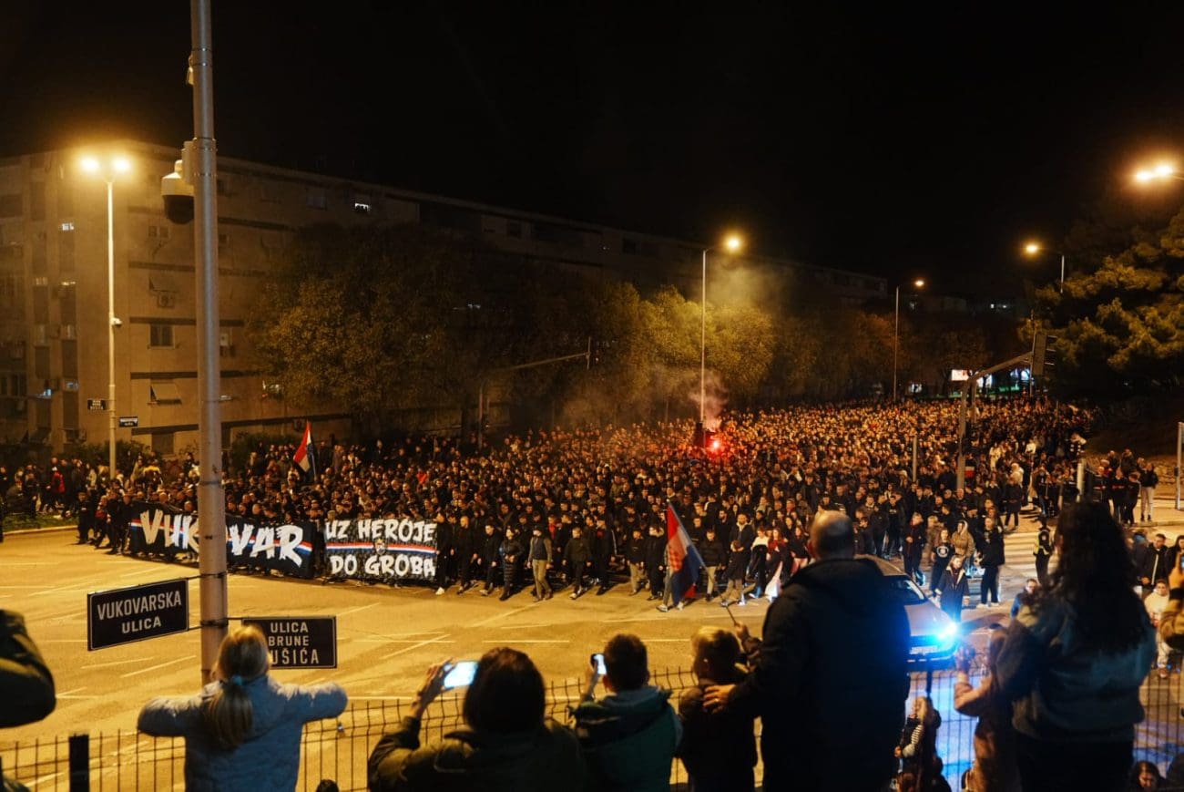 Tisuće Splićana, navijača Hajduka, branitelja i građana pridružile su se povorci duž Vukovarske ulice. Sudionici su nosili transparente ‘Vukovar – uz heroje do groba’.