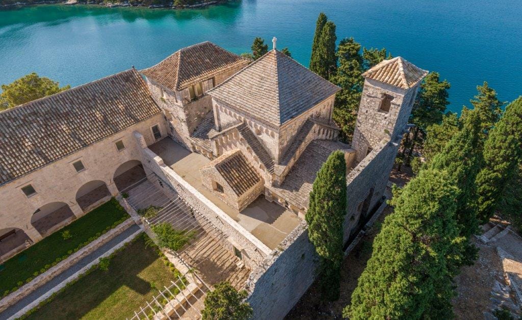 Svoju vizuru ovaj je simbol otoka dobio u razdoblju od 1177. do 1198. godine, kada je na njemu izgrađena crkva sv. Marije s benediktinskim samostanom. Tijekom godina samostan je više puta bio pregrađivan pa danas zrači renesansnim stilom, uz poneke barokne detalje, dok je samostanska crkva tipičnog romaničkog stila. U potpunoj tišini mora, mirnoći jezera i sjeni stoljetnih šuma česvine i bora, benediktinski su se redovnici nesmetano i ustrajno posvetili znanosti i umjetnosti te izrazito utjecali na razvoj pismenosti i kulture na Mljetu. Pisali su po pergameni koju bi sami izradili,baš kao i pisaći pribor i tekućinu za pisanje. Samostan je inače imao i veliku knjižnicu, jednu od najbogatijih u Dalmaciji.