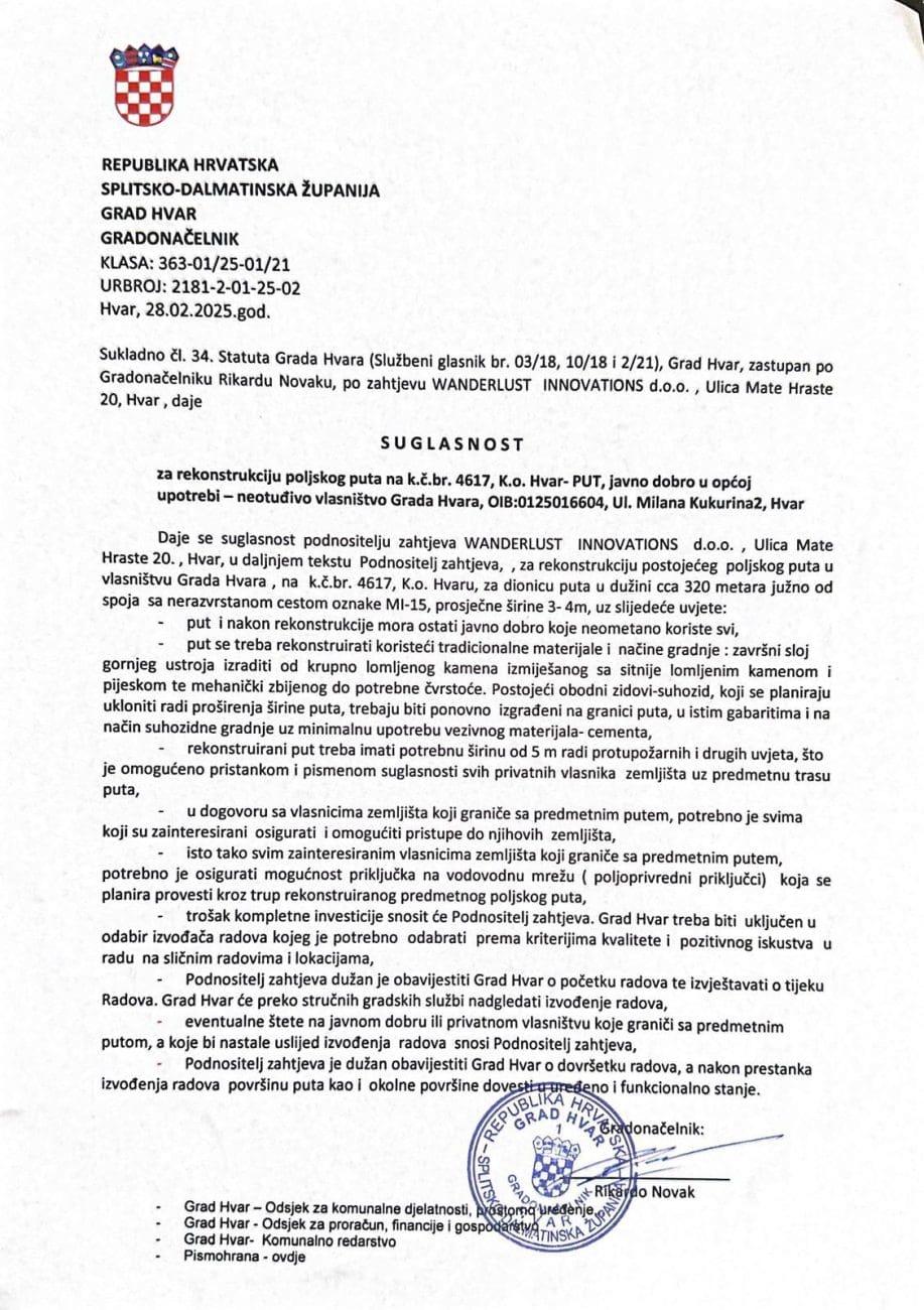 Područje na kojem su započeli radovi nalazi se u zoni zaštitnih šuma (Š2) te unutar ekološke mreže Natura 2000, gdje su zahvati strogo ograničeni. Prema dostupnoj dokumentaciji, bivši gradonačelnik Grada Hvara dao je suglasnost za rekonstrukciju dijela postojećeg poljskog puta u duljini od oko 320 metara, no sporne parcele nalaze se dodatnih 500 do 600 metara dalje. Također, u tekstu bivšeg gradonačelnika koji je dopustio ‘rekonstrukciju’ – kako su opisani radovi gospođe Jenkins – stoji da je rekonstrukcija omogućena pismenom suglasnosti svih privatnih vlasnika uz trasu puta – a od 60-ak potpisa, Jenkins je imala samo nekoliko.