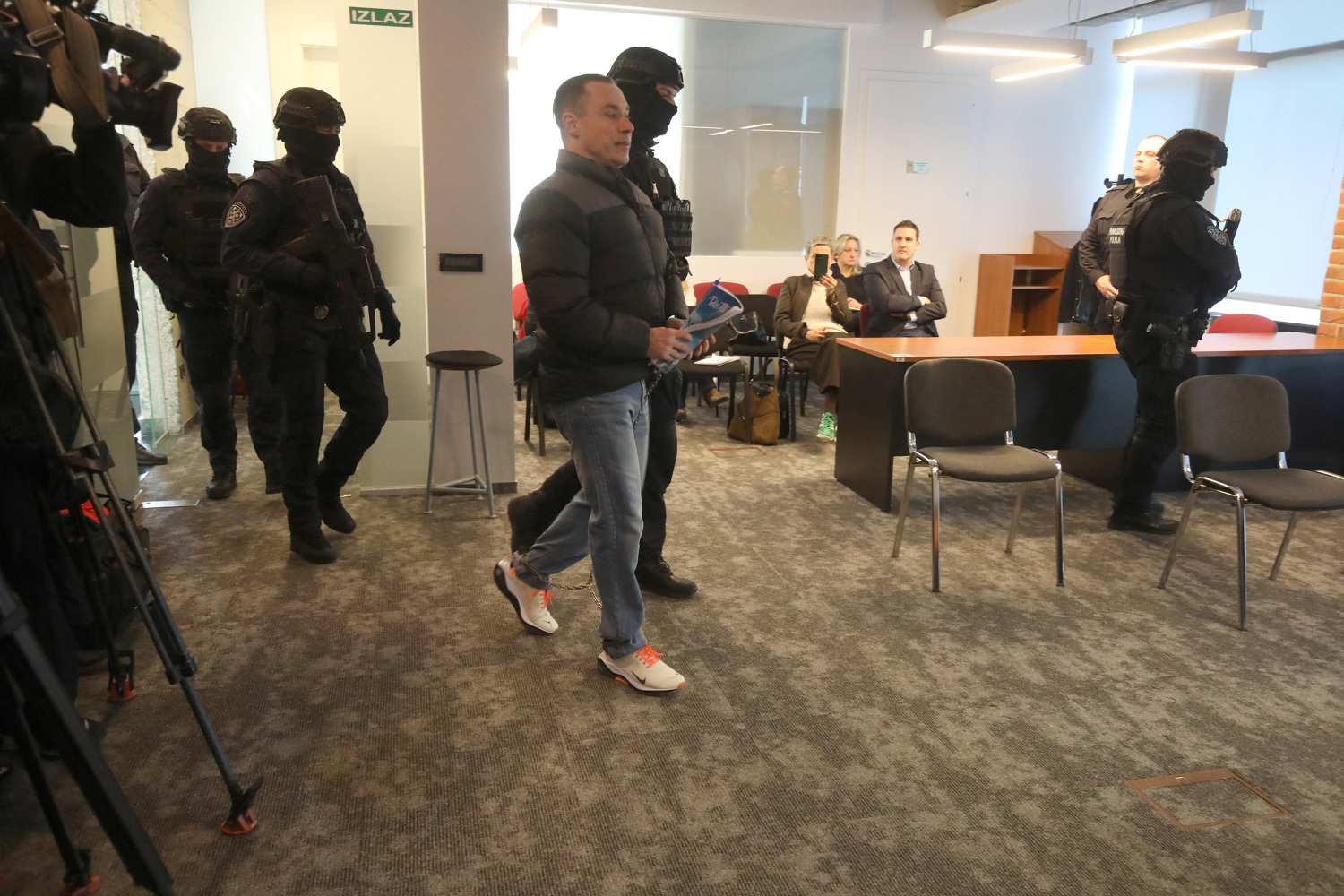Danas je doveden na Županijski sud u Varaždinu uz iznimno jake mjere osiguranja, u pratnji petorice policajaca s dugim cijevima. “Prestanite biti apologeti, plašiti javnost Hrvatske sa mnom!”, poručio je okupljenim novinarima.