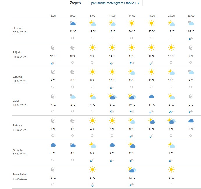 “U srijedu će u unutrašnjosti Hrvatske biti većinom sunčano. Od četvrtka postupno oblačnije, a u petak će ponegdje padati kiša, uglavnom u unutrašnjosti Dalmacije te u Gorskoj Hrvatskoj gdje će, osobito u višim predjelima, biti i snijega. Puhat će umjeren, većinom sjeverni i sjeverozapadni vjetar, u petak sjeveroistočni. Temperatura u padu.