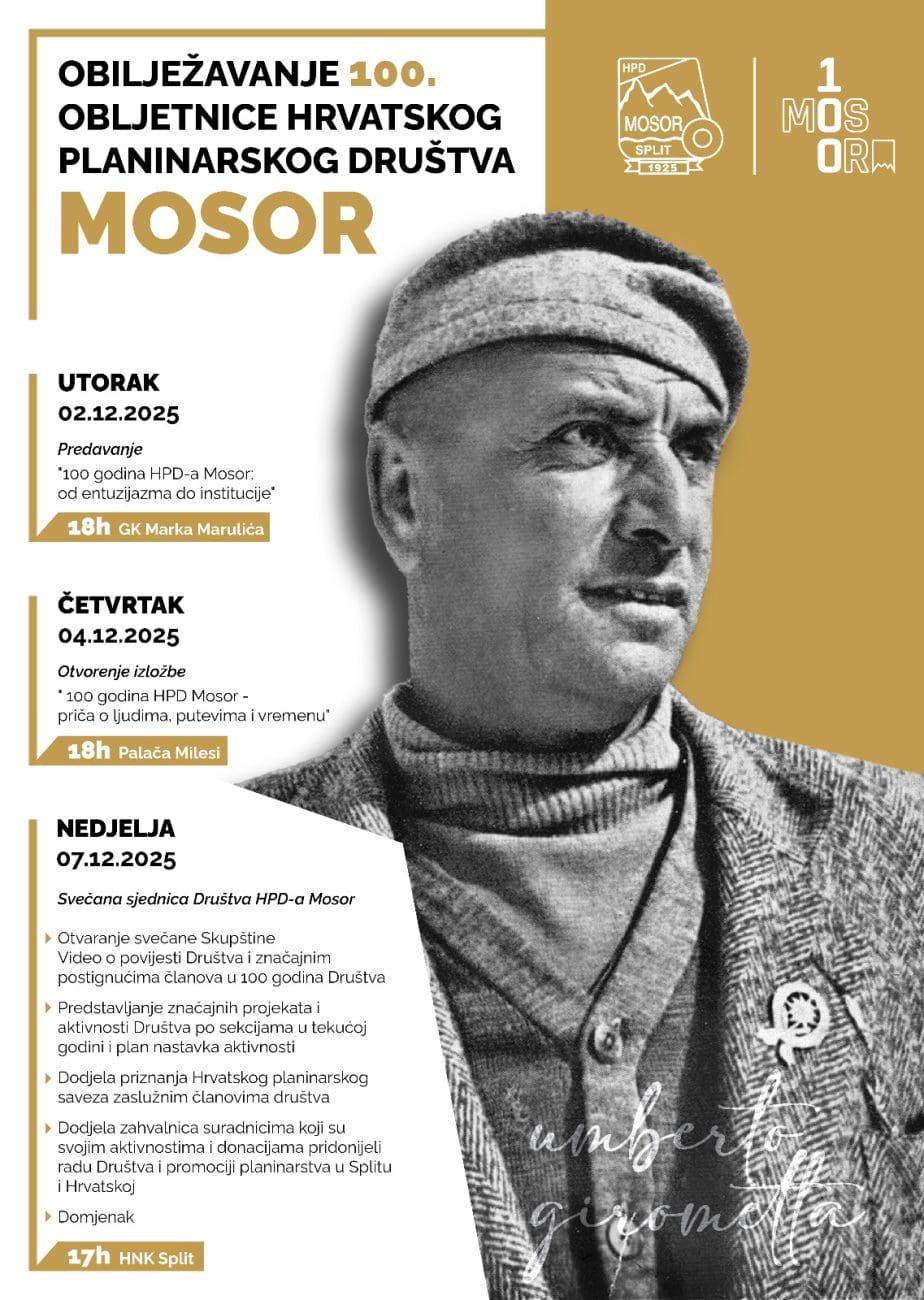 U četvrtak, 4. prosinca 2025., u 18 sati u Palači Milesi, slijedi otvorenje izložbe „100 godina HPD Mosor – priča o ljudima, putevima i vremenu“, koja će kroz fotografije i arhivsku građu predstaviti bogatu povijest društva.