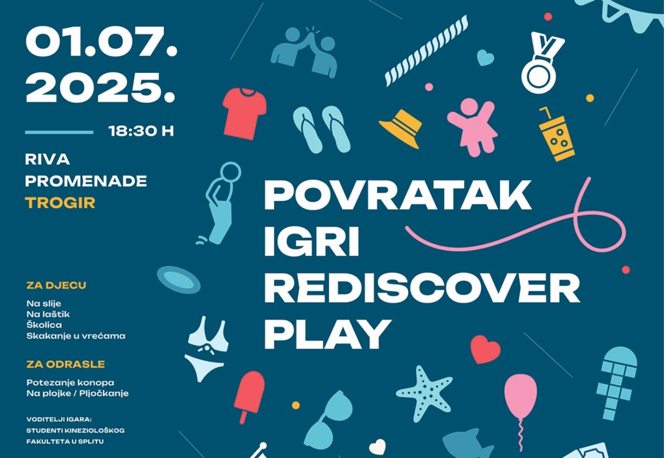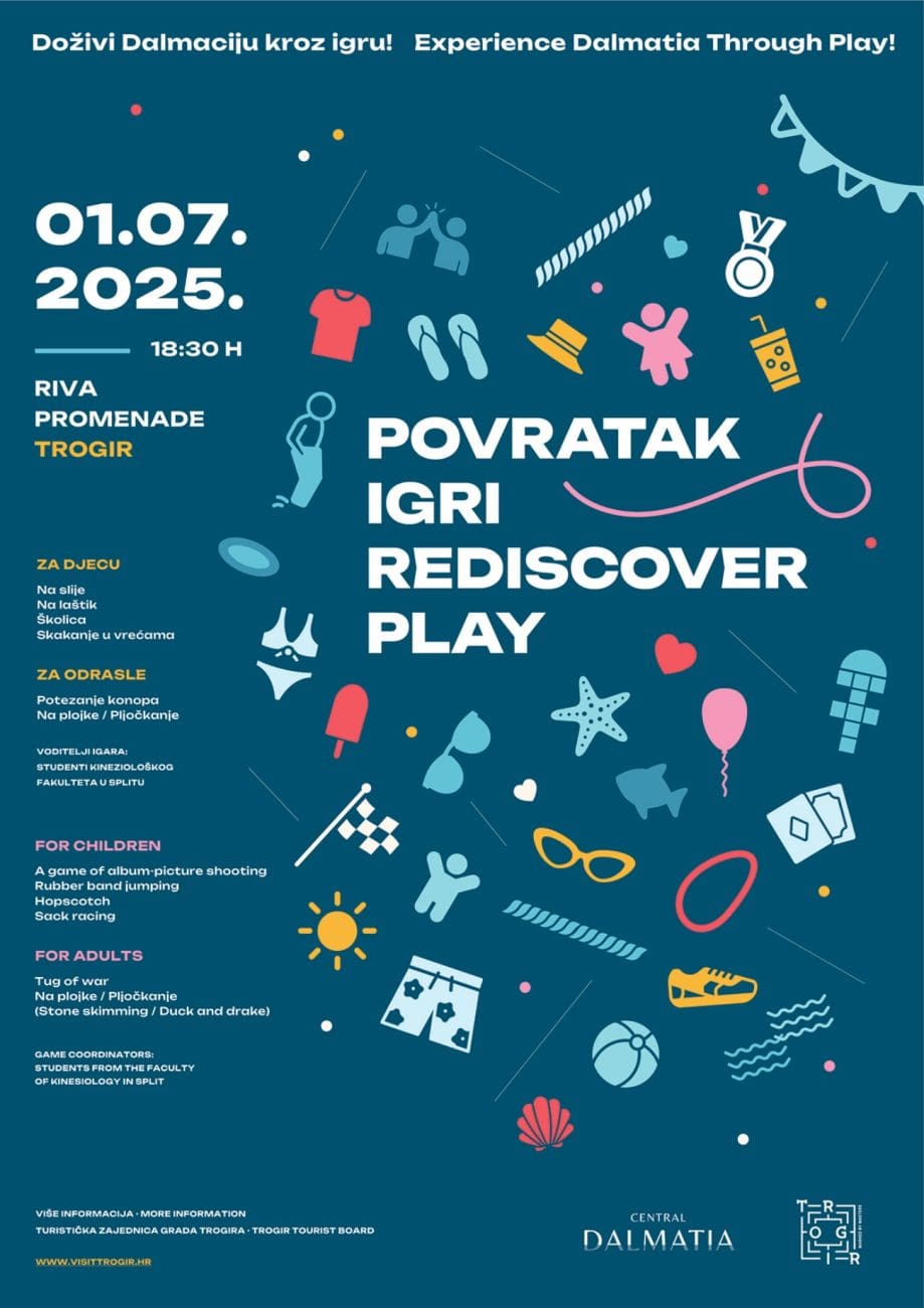 Na trogirskoj rivi u utorak, 1. srpnja, održat će se sportsko-zabavni događaj pod nazivom “Povratak igri”, u organizaciji Turističke zajednice Splitsko-dalmatinske županije i Kineziološkog fakulteta u Splitu, uz domaćinstvo Turističke zajednice grada Trogira. Program počinje u 18:30 sati, a očekuje se velik odaziv djece, odraslih i posjetitelja.