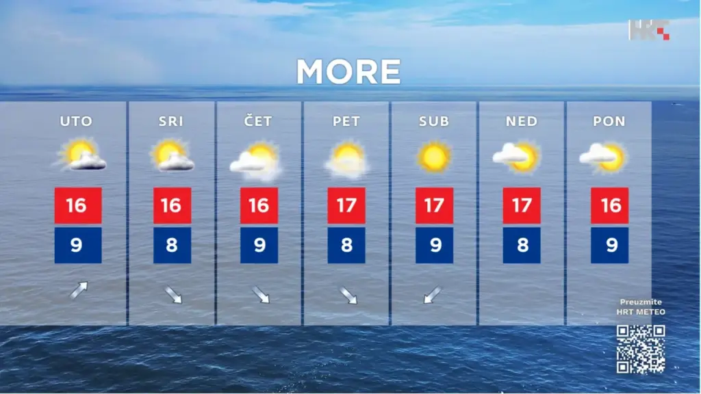 Slično razmjerno toplo vrijeme očekuje se i na Jadranu, gdje će prevladavati sunčana razdoblja uz postupno naoblačenje. U drugom dijelu tjedna moguća je prolazna promjena vjetra, a u subotu na sjevernom Jadranu i bura.