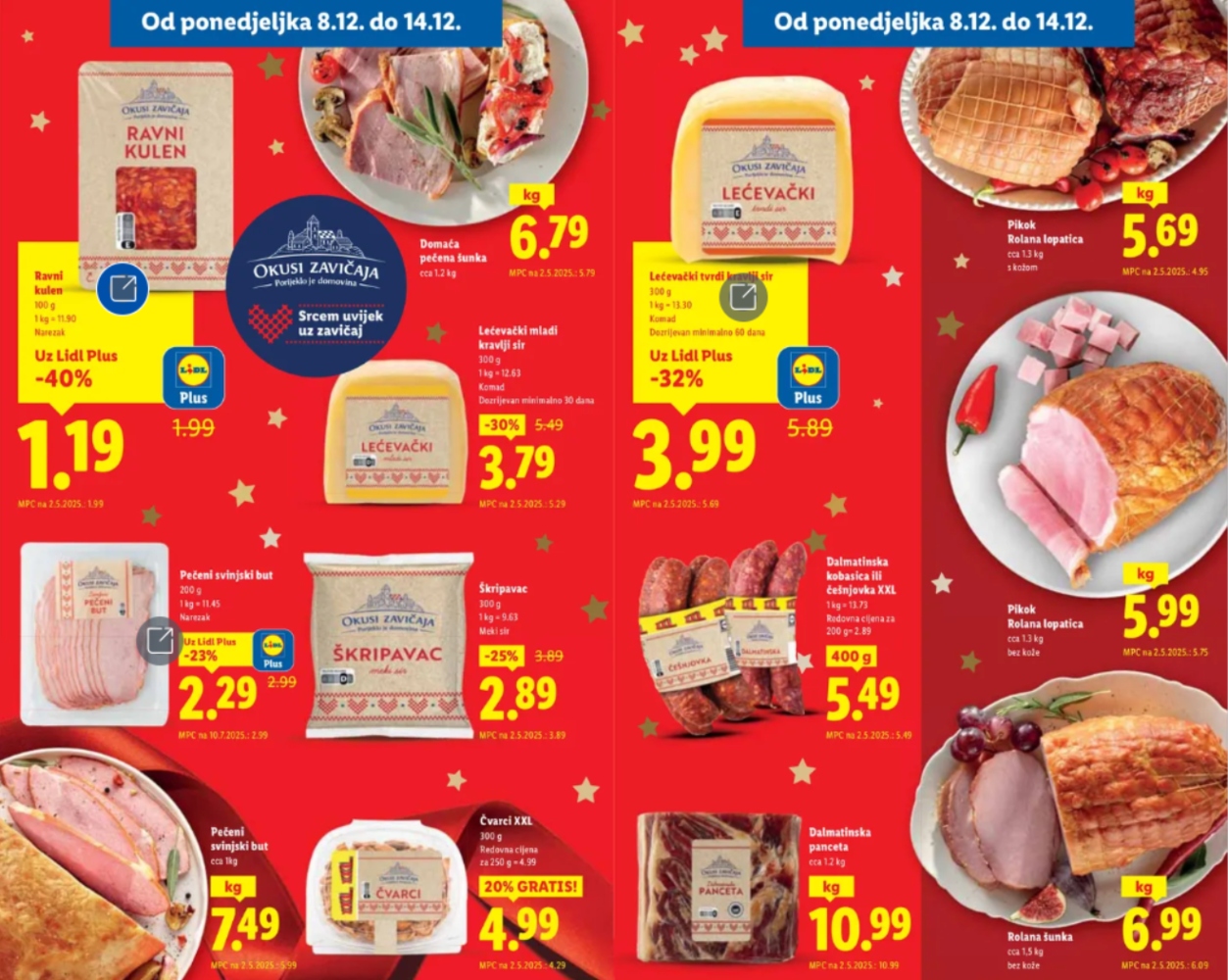 Domaći kelj možete naći po cijeni od 0,69 umjesto 0,99 eura, odnosno na akciji od 30 posto, uz aplikaciju Lidl Plus. Ravni kulen Okusi zavičaja u pakiranju od 100 grama, snižen je s 1,99 na 1,19 eura, uz aplikaciju, što znači da je jeftiniji za 40 posto. Sir škripavac Okusi zavičaja u pakiranju od 300 grama prodaje se po 2,89 umjesto 3,89 eura, što je sniženje od 25 posto.