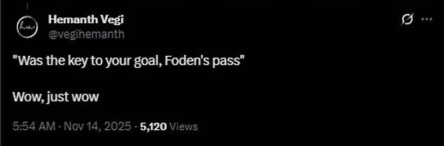 ‘Ne gaslight dodavanje od 5 jardi’, napisao je jedan korisnik na X. ‘Da je Foden zabio dodavanjem Ezea, nikad mu ne bi postavili to pitanje.’